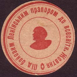1930 1930(?) г. Круг диаметром 44 мм. Одноцветная печать на желтоватой бумаге. В тройной круглой рамке диаметром 43 мм в центре силуэт В.И.Ленина. По периметру между рамками текст на украинском языке: «Под боевым Ленинским знаменем к всемирн[ому]. Октябрю».