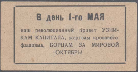 1929 1929 г. Разм. 88 х 44 мм Одноцветная печать на бумаге различных цветов. В прямоугольной рамке разм. 72 х 38 мм текст в пять строк: «В день 1-го мая наш революционный привет узникам капитала, жертвам кровавого фашизма, борцам за мировой октябрь!».