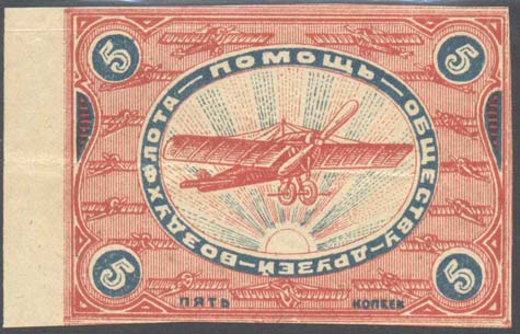 1924 1924 г. Разм. рамки 69 х 48 мм. В двойной прямо-угольной рамке в центре дополнительная двойная овальная рамка. В овальной рамке в центре самолет-моноплан, летящий вправо в лучах восходящего солнца. По периметру между овальными рамками текст: «Помощь Обществу друзей Воздухфлота». По внутренним углам прямоугольной рамки цифры номинала в круглых рамках. Пространство между рамками заполнено фоном из вертикальных штрихов и самолетов. Внизу номинал в виде текста.