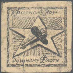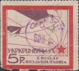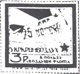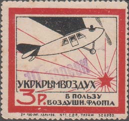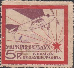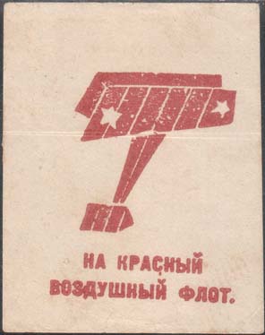 1924 1924(?) г. Разм. рамки 32 х 32 мм. Одноцветная печать на светло-коричневой бумаге. В прямоугольной рамке на фоне пятиконечной звезды самолет, летящий вправо вверх. Сверху текст: «Красному». Внизу продолжение текста: «Воздушному флоту».