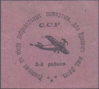 1924 1924(?) г. Разм. 54 х 49 мм. Одноцветная печать на темно-розовой бумаге. В центре самолет-моноплан, летящий вправо. Сверху аббревиатура «С.С.Р.». Внизу текст: «3-й райком». По окружности текст: «Комиссия по сбору добровольных пожертвов[аний]. для Красного возд[ушного]. Флота».