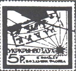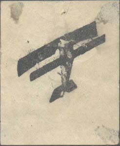 1924 1924(?) г. Разм. 42 х 51 мм. Одноцветная печать на белой бумаге ручным штампом. В центре самолет-биплан, летящий вверх.