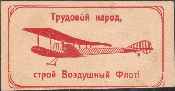 1924 1924(?) г. Разм. 49 х 62 мм. Одноцветная печать на белой бумаге. В центре самолет-биплан, летящий вверх. Внизу текст в две строки: «На красный воздушный флот».