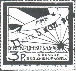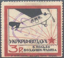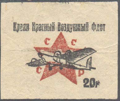 1930 1930 г. Разм. рамки 64 х 52 мм. Двухцветная печать на желтоватой бумаге. В центре на фоне пятиконечной звезды многомоторный самолет, летящий влево. Между лучами звезды буквы аббревиатуры «СССР». Справа внизу номинал.