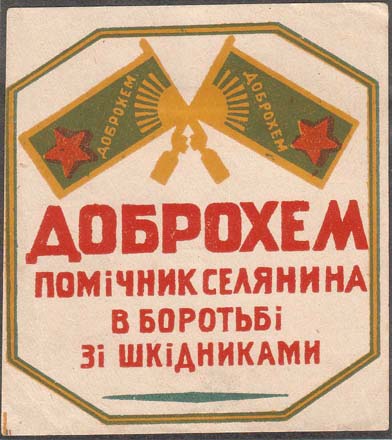 1924 1924 г. Разм. 68 х 74 мм. Трехцветная печать на белой бумаге. В восьмиугольной рамке разм. 63 х 67 мм два скрещенных флага. Под флагами текст в четыре строки на украинском языке: «ДОБРОХИМ помощник крестьянина в борьбе с вредителями».