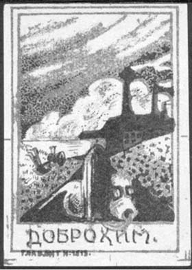 1924 1924(?) г. Разм. рамки 40 х 60 мм. Двухцветная печать низкого качества на желтоватой бумаге. Противогаз и реторта на фоне завода. Внизу текст: «ДОБРОХИМ». Под рамкой внизу выходные данные мелким шрифтом данные: «Главлит N 1513».