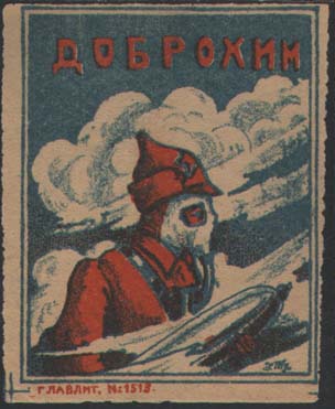 1924 1924(?) г. Разм. рамки 45 х 58 мм. Двухцветная печать низкого качества на желтоватой бумаге. Красноармеец в противогазе со снарядом в руке на фоне клубов дыма. Сверху текст: «ДОБРОХИМ». Под рамкой внизу выходные данные мелким шрифтом данные: «Главлит N 1513».