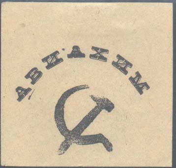 1925 1925(?) г. Разм. 59 х 56 мм. Одноцветная печать на бумаге различных цветов. В центре серп и молот. Сверху полукругом аббревиатура «АВИАХИМ».