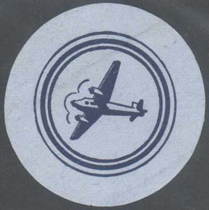 1926 1926(?) г. Круг диаметром 48 мм. Одноцветная печать на голубой бумаге. В тройной круглой рамке самолет, летящий влево.