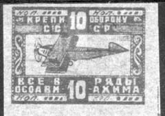 1927 1927 г. Разм. рамки 32 х 24 мм. Одноцветная печать на желтоватой бумаге. В рамке самолет-биплан, летящий влево. Сверху и снизу номинал и текст в четыре строки: «Крепи оборону СССР. Все в ряды ОСОАВИАХИМА».