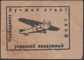 1927 1927(?) г. Разм. 48 х 34 мм. Одноцветная печать на светло-серо-зеленоватой бумаге. В прямоугольной рамке разм. 37 х 26 мм самолет-моноплан, летящий вправо. По внутреннему периметру рамки текст: «Лучший ответ Чемберлену. Укрепляй воздушный флот».