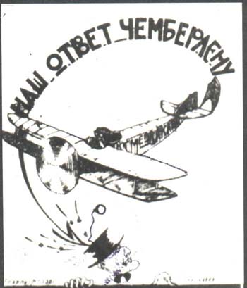 1927 1927(?) г. Разм. 58 х 70 мм. Одноцветная печать на белой бумаге. Аллегорический рисунок: самолет сбрасывает бомбу на голову Чемберлена. Сверху текст: «Наш ответ Чемберлену». Внизу мелким шрифтом выходные данные: «Главлит №3301. Тир. 60000».