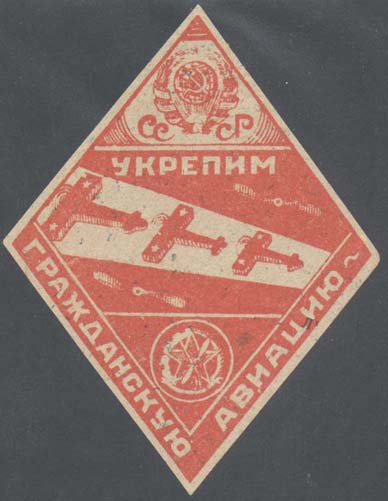 1927 1927(?) г. Ромб разм. 64 х 83 мм. Одноцветная печать на светло-серой бумаге. В ромбовидной рамке в центре три самолета-биплана, летящих влево и два пропеллера. Сверху герб СССР с семью лентами, внизу эмблема ОСОАВИАХИМ. Сверху текст: «Укрепим». Внизу параллельно рамке продолжение текста: «Гражданскую авиацию».