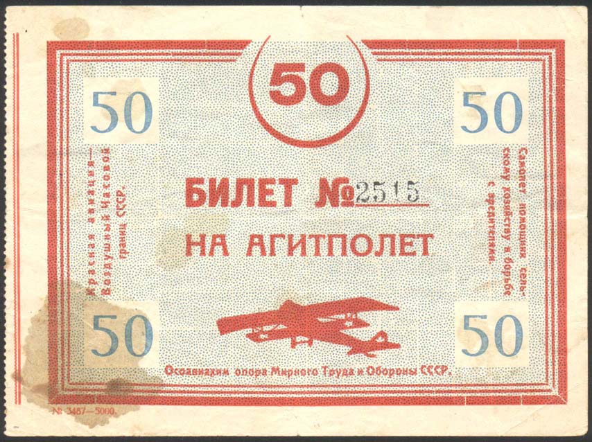 1927 1927(?) г. Квитанция разм. 142 х 104 мм. Двухцветная печать на белой бумаге. Левосторонняя зубц. 11 1/2. В тройной прямоугольной рамке в центре текст в две строки: «Билет № ... на агитполет». Внизу силуэт самолета-биплана. Сверху и по углам номинал. Внизу текст: «Осоавиахим опора Мирного Труда и Обороны СССР». Слева вертикально текст в три строки снизу вверх: «Красная авиация – Воздушный Часовой границ СССР». Справа вертикально текст в три строки сверху вниз: «Самолет помощник сельскому хозяйству в борьбе с вредителями». Слева внизу под рамкой мелким шрифтом выходные данные: «3487-5000».