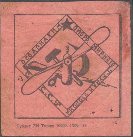 1928 1928 г. Разм. рамки 60 х 58 мм. Одноцветная печать на розово-красной бумаге. В центре в двойной рамке в форме ромба эмблема ОСОАВИАХИМ. По периметру между рамок текст: «ОСОАВИАХИМ опора мирного труда и обороны С.С.С.Р.». Внизу под рамкой мелким шрифтом выходные данные: «Гублит 734. Тираж 10000. 1109-28».