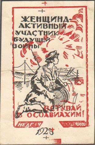 1928 1928 г. Разм. 50 х 74 мм. Двухцветная печать на толстой белой бумаге. Прямоугольная рамка снизу переходит в ленту. На ленте текст: «Неделя обороны». В разрыве ленты дата: «1928». В центре связистка на фоне солнца и облаков. Слева сверху текст в пять строк: «Женщина – активный участник будущей войны». Внизу текст в две строки: «Вступай в ОСОАВИАХИМ!».