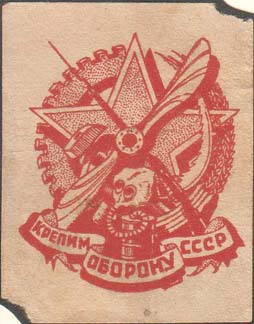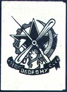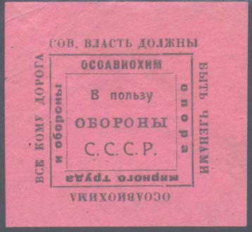 1930 1930(?) г. Разм. 58 х 54 мм. Одноцветная печать на малиновой бумаге. В центре в двойной прямоугольной рамке разм. 34 х 30 мм текст в три строки: «В пользу обороны С.С.С.Р.». По периметру между рамками текст: «Осоавиахим опора мирного труда и обороны». По наружному периметру рамки текст: «Все кому дорога сов[етская]. власть должны быть членами Осоавиахима».