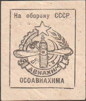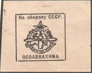 1930 1930(?) г. Разм 50 х 40 мм. Одноцветная печать на белой бумаге. В центре в прямоугольной рамке разм. 28 х 26 мм эмблема АВИАХИМ. Сверху текст: «На оборону СССР». Внизу аббревиатура «ОСОАВИАХИМА».