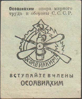 1930 1930(?) г. Разм. 53 х 64 мм. Одноцветная печать на бумаге различных цветов. В центре эмблема ОСОАВИАХИМ. Сверху текст в две строки: «Осоавиахим опора мирного труда и обороны С.С.С.Р.». Внизу текст в две строки: «Вступайте в члены ОСОАВИАХИМ». На оборотной стороне фиолетовый оттиск номинала.