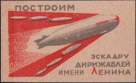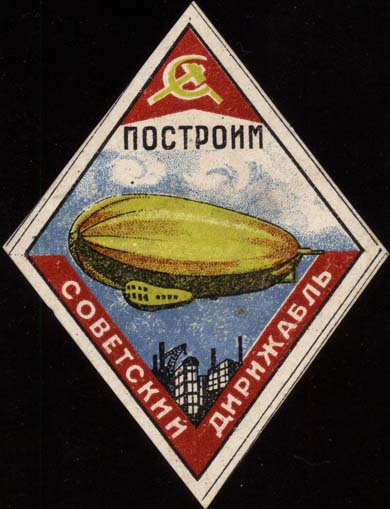 1930 1930(?) г. Ромб разм. рамки 52 х 78 мм. Многоцветная печать на белой бумаге. В рамке в центре дирижабль над заводскими зданиями. Сверху серп и молот. Текст: «Построим советский дирижабль».