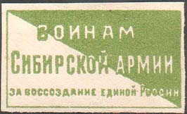 1918 1918 г. Разм. 42 х 23 мм. Одноцветная печать на толстой белой бумаге. Бело-зеленый флаг Сибирской армии. Текст в три строки: «Воинам Сибирской армии. За воссоздание единой России».