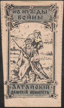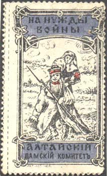1915 1915(?) г. Разм. рамки 28 х 52 мм. Двухцветная и трехцветная печать на белой бумаге. Зубц. 11 1/2 и Б.З. В центре сестра милосердия перевязывает сидящего раненого. Сверху текст в две строки: «На нужды войны». Внизу текст в две строки: «Алтайский дамский комитет». Под рамкой выходные данные мелким шрифтом: «Лит. Алт. Окр.».