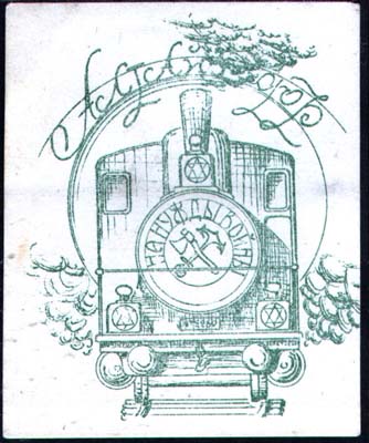 1915 1915(?) г. Одноцветная печать на белой бумаге. Разм. 54 х 66 мм. В центре паровоз, вид спереди. Сверху полукругом текст: «Алт[айская]. Дор[ога].». На паровозе путейский значок и текст: «На нужды войны».