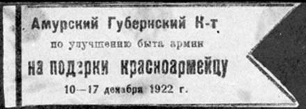 1922 1922 г. 10.-17.12.1922 г. Разм. 79 х 26 мм. Одноцветная печать на светло-красной бумаге. Виньетка в виде флажка с фестончатым правым краем. Текст в четыре строки: «Амурский Губернский К-т по улучшению быта армии. На подарки красноармейцу 10-17 декабря 1922 г.».