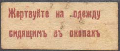 1917 1917 г. 07.08.1917 г. Разм. 40 х 16 мм. Одноцветная печать на рыхлой желтоватой бумаге. В центре текст в две строки: «Жертвуйте на одежду сидящим в окопах».