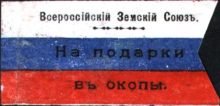 1916 1916 г. 16.02.1916 г. Виньетка в виде российского флага разм. 73 х 36 мм. С правой стороны вырез в виде фестона. Трехцветная печать на белой бумаге. Сверху текст: «Всероссийский Земский Союз». Ниже текст в две строки: «На подарки в окопы».