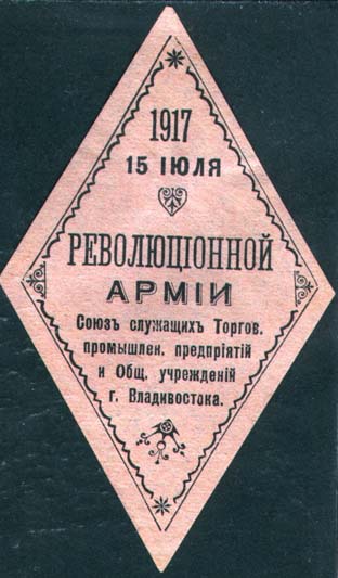 1917 1917 г. 15.07.1917 г. 1917 г. (15.07.1917 г.). Ромб разм. рамки 46 х 90 мм. Одноцветная печать на светло-розовой бумаге. В центре текст в две строки крупным шрифтом: «Революционной армии». Сверху дата в две строки: «1917 15 июля» и декоративный эле-мент. Внизу текст в четыре строки: «Союз служащих Торгов[во]. Промышлен[ных]. предприятий и Общ[ественных]. учреждений г. Владивостока» и декоративный элемент.