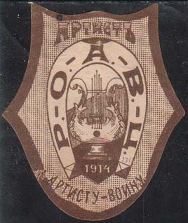 1915 1915 г. Виньетка в виде щитка сложной формы разм. 44 х 52 мм. Одноцветная печать на белой бумаге. В центре эмблема РОАВЦ. Сверху текст: «Артист». Внизу продолжение текста: «Артист-воину».