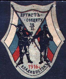 1916 1916 г. 16.02.1916 г. Виньетка в виде щитка сложной формы разм. 51 х 44 мм. Трехцветная печать на тонкой желтоватой бумаге. На фоне двух скрещенных российских флагов солдат и артист пожимают друг другу руки. Сверху текст в три строки: «Артист – солдату 16/II». Внизу продолжение текста в две строки: «1916 г. Владивосток».