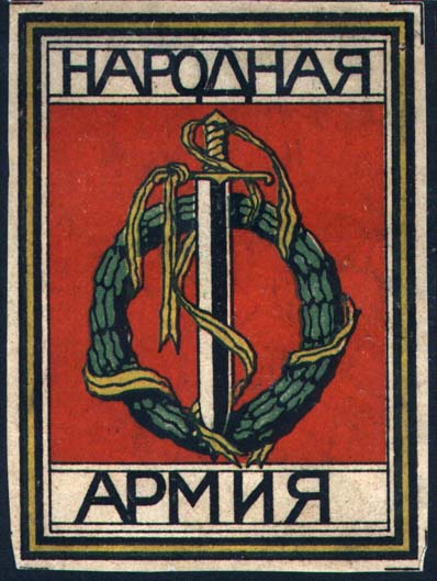 1919 1919(?) г. Разм. рамки 61 х 84 мм. Многоцветная печать на желтоватой бумаге. В центре в тройной прямоугольной рамке круглый венок, перевитый лентой и меч. Текст: «Народная армия».