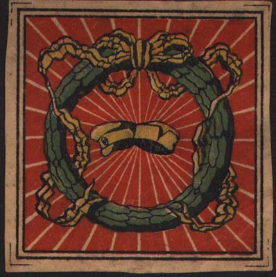 1915 1915(?) г. Разм. 34 х 48 мм. Одноцветная печать на толстой белой бумаге. В прямоугольной рамке разм. 30 х 41,5 мм стилизованное изображение ели и текст в шесть строк: «К празднику Рождества Христова на подарки воинам».