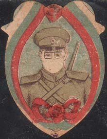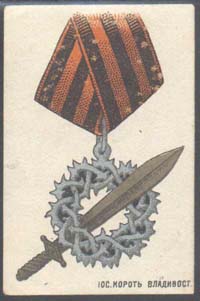1920 1920(?) г. Разм. 32 х 49 мм. Многоцветная печать на белой бумаге. В центре наградой знак белого движения: терновый венец и меч на колодке. Внизу мелким шрифтом выходные данные: «Иос. Корот Владивосток».