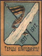 1917 1917 г. Разм. 27 х 37 мм. Трехцветная печать на сероватой бумаге. В центре герб Терской области и дата: «1577-1917». Внизу текст: «Терцы благодарят!».