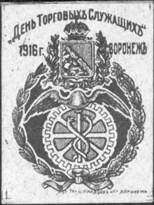 1916 1916 г. Разм. 36 х 48 мм. Двухцветная печать на толстой желтоватой бумаге. В центре эмблема торгово-промышленной палаты(?) в обрамлении венка. Сверху герб Воронежа. Текст в две строки: «День торговых служащих» 1916 г. Воронеж». В правом нижнем углу выходные данные мелким шрифтом: «Лит. Т. Н. Кравцов и Ко Воронеж».