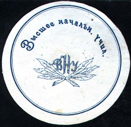 1916 1916 г. 10.11.1916 г. Круг диаметром 70 мм. Одноцветная печать на белой бумаге. В центре в двойной круглой рамке диаметром 61,5 мм скрещенные лавровые ветки и аббревиатура «ВНУ». Сверху полукругом текст: «Высшее начальн[ое]. учил[ище].».