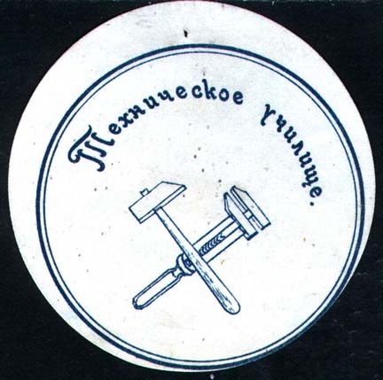 1916 1916 г. 10.11.1916 г. Круг диаметром 70 мм. Одноцветная печать на белой бумаге. В центре в двойной круглой рамке диаметром 61,5 мм скрещенные разводной ключ и молоток. Сверху полукругом текст: «Техническое училище».