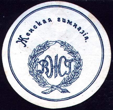 1916 1916 г. 10.11.1916 г. Круг диаметром 70 мм. Одноцветная печать на белой бумаге. В центре в двойной круглой рамке диаметром 61,5 мм аббревиатура «ВЖГ» в обрамлении венка из лавровых листьев. Сверху полукругом текст: «Женская гимназия».