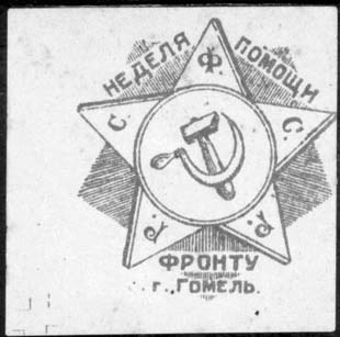 1922 1922 г. 22.10.1922 г. Разм. 51 х 51 мм. Одноцветная печать на желтоватой бумаге. Пятиконечная звезда, в центре которой в круге серп и молот. В лучах буквы аббревиатуры: «Р.С.Ф.С.Р.». Сверху между лучами текст: «Неделя помощи». Внизу продолжение текста в две строки: «Фронту г. Гомель».