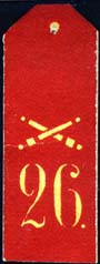 1914 1914 г. 07.12.1914 г. Виньетка в виде погона разм. 13 х 37 мм. Двухцветная печать на белой бумаге. Погон с артиллерийской эмблемой и цифрой 26.