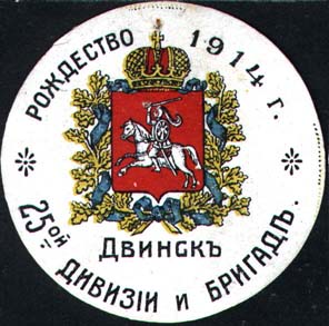 1914 1914 г. Круг диаметром 48 мм. Многоцветная печать на желтоватой бумаге с мелованным верхним слоем. В центре герб Витебской губернии. Сверху полукругом текст: «Рождество 1914 г.». Внизу текст: «Двинск 25-ой дивизии и бригаде».