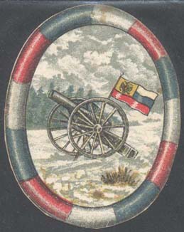 1914 1914 г. 06.12.1914 г. Овал разм. 43 х 53 мм. Многоцветная печать на плотной белой бумаге. В овальной рамке из поперечных полос цветов российского флага в центре орудие и новый национальный флаг России. На заднем плане лес.