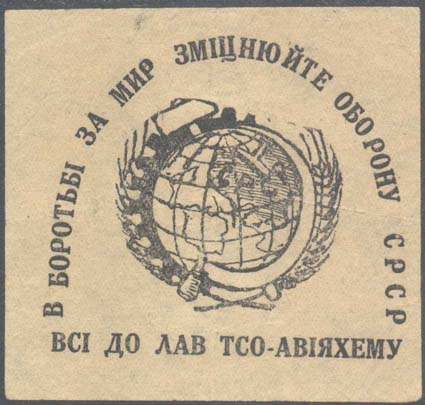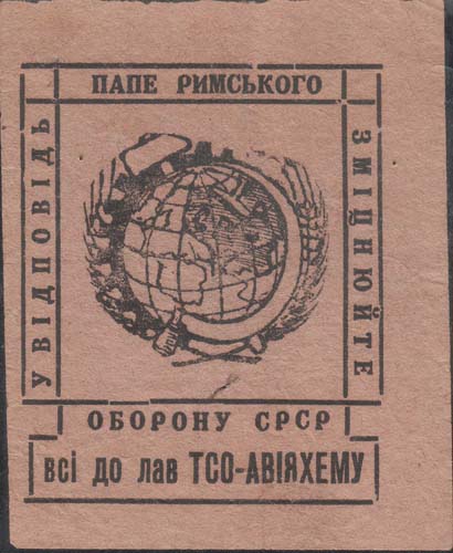 1930 1930(?) г. Разм. 68 х 83 мм. Одноцветная печать на тонкой серой бумаге низкого качества. В двойной прямоугольной рамке разм. 56 х 66 мм в центре земной шар на фоне венка, шестеренки и серпа и молота. По периметру между рамками текст на украинском языке: «В ответ Папе Римскому крепите оборону СССР. Все в ряды ОСОАВИАХИМа».