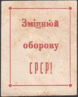 1930 1930(?) г. Разм. 43 х 53 мм. 0дноцветная печать на белой бумаге. В прямоугольной рамке разм. 34 х 43 мм с декоративными элементами в виде ромбиков по углам текст на украинском языке в три строки: «Укрепляй оборону СССР!».