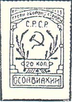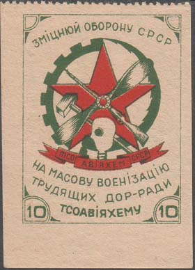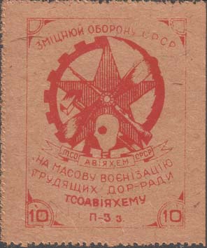 1930 1930(?) г. Разм. рамки 23 х 34 мм. Нерегулярная зубц. Одноцветная печать на бумаге различных цветов. В центре серп и молот в обрамлении колосьев. Выше аббревиатура на украинском языке «С.С.С.Р.». Ниже в прямоугольной рамке номинал. Сверху на ленте текст: «Крепи оборону страны». Внизу аббревиатура «ОСОАВИАХИМ».