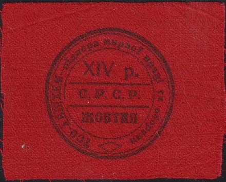 1931 1931 г. Разм. ≈ 72 х 58 мм. Одноцветная печать на темно-красной материи. В центре в рамке из концентрических окружностей текст в три строки на украинском языке: «XIV г. Октября. С.С.С.Р.». По периметру между рамками текст на украинском языке: «ОСО-Авиахим – опора мирного труда и обороны».