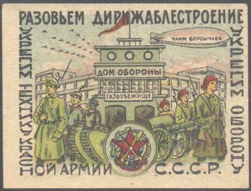1932 1932 г. Разм. рамки 62 х 46 мм. Многоцветная печать на белой бумаге. В центре войска перед Домом Обороны, сверху дирижабль «Клим Ворошилов», внизу эмблема ОСОАВИАХИМ. По периметру рисунка текст: «Разовьем дирижаблестроение. Укрепим технику Красной Армии. Укрепим оборону СССР».